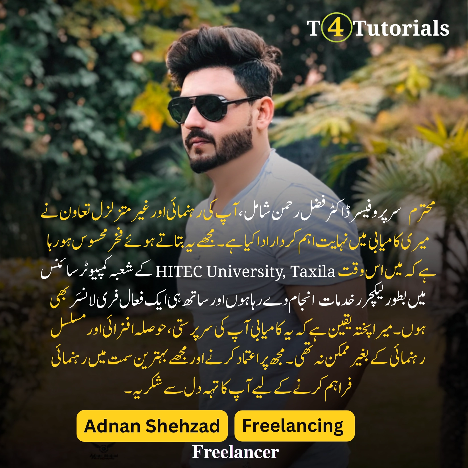 Today, we are honored to share the inspiring journey of Adnan Shehzad, whose achievement reflects the true mission of T4Tutorials — empowering individuals to excel in both academia and the freelancing world.